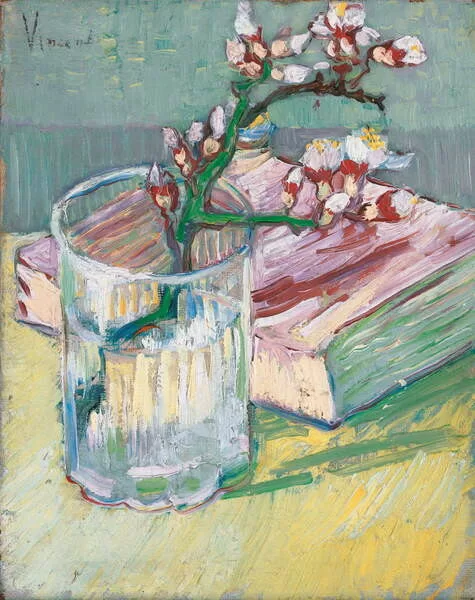 Canvastavla Flowering almond branch in a glass with a book, 1888