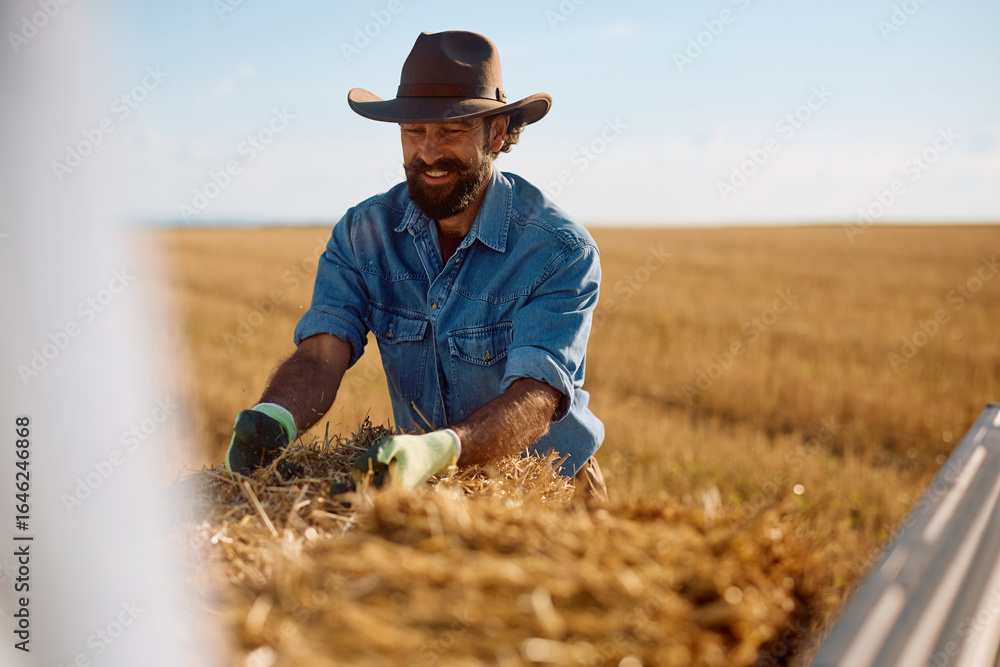 Canvastavla Happy farmer loading hale bales in back of his truck.