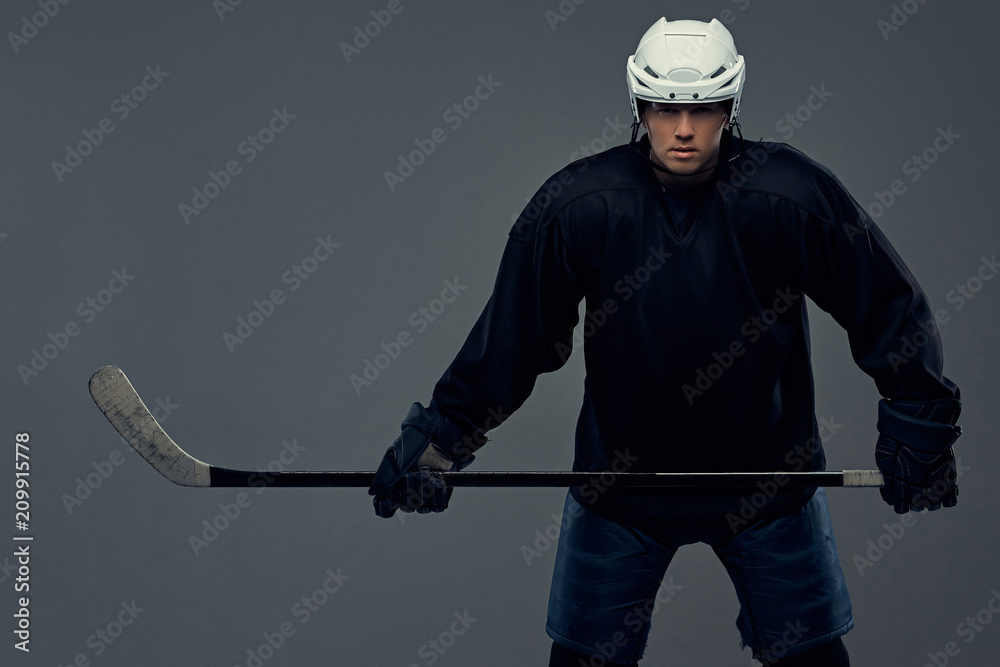Canvastavla Hockey player wearing black protective gear and white helmet holds a hockey stick on a gray background