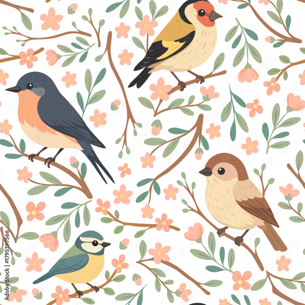 Fototapet Seamless spring bird pattern with blooming branches and pastel florals