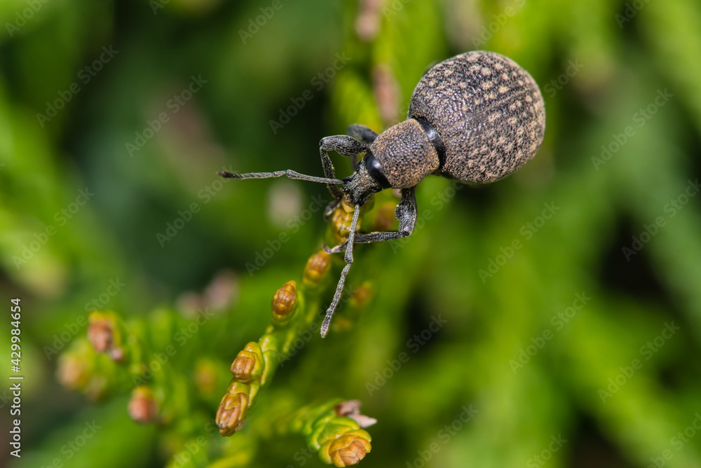 Fototapet Makroaufnahme eines Dickmaulrüssler welcher gerade die Knospen einer Thuje friss