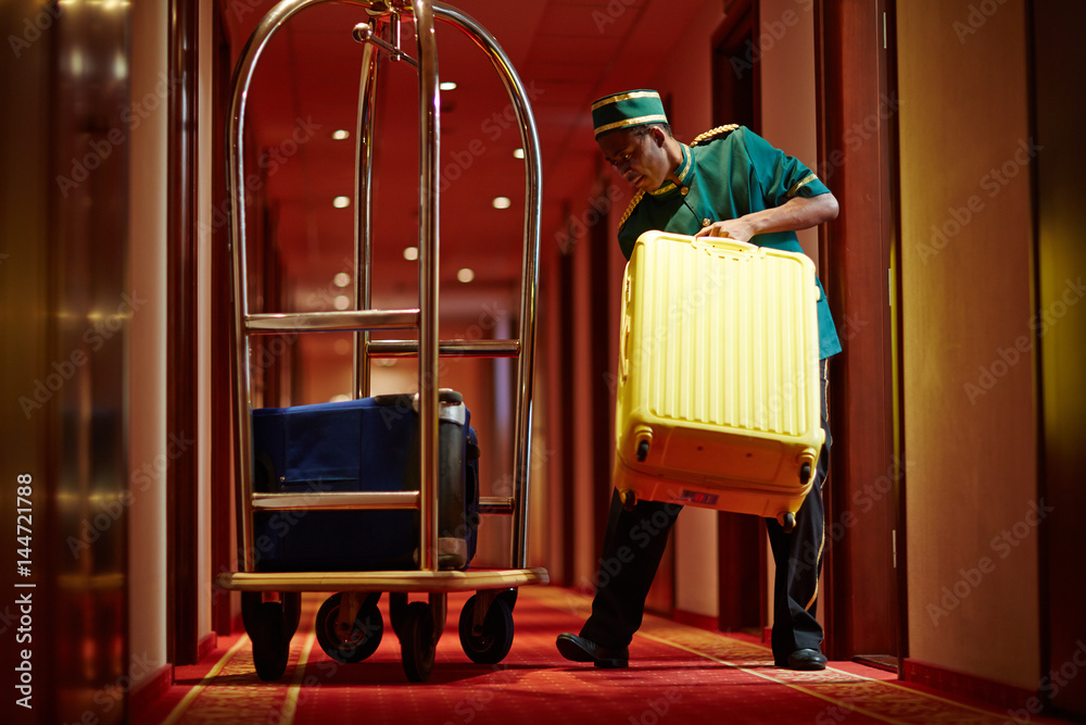 Klistermärke Hotel servant taking out suitcase with baggage from hotel room