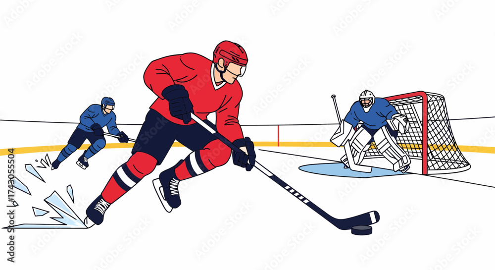 Konstfotografi Hockey players in action Forward skating with puck goalie defending the net